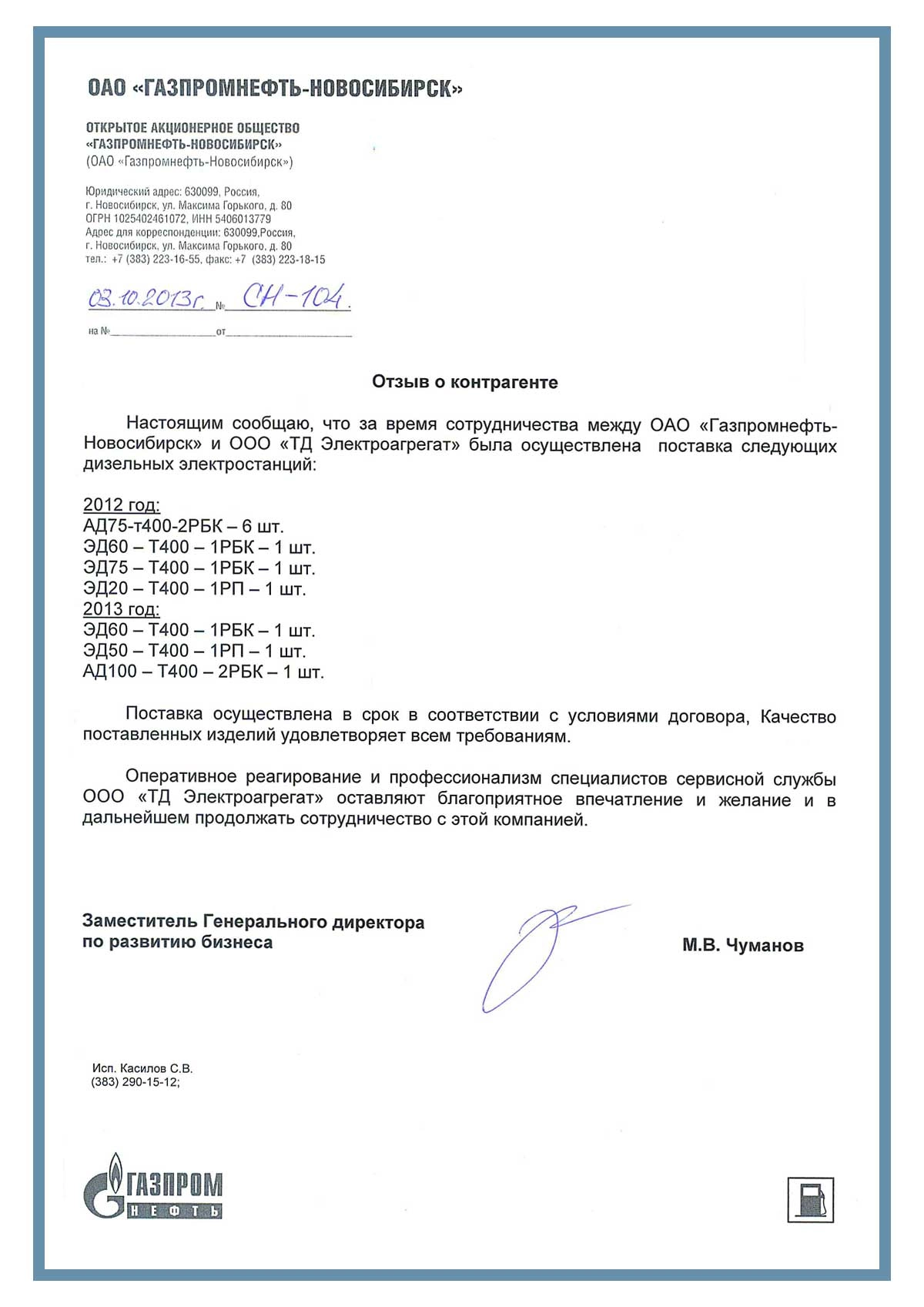 Отзыв ОАО «Газпромнефть - Новосибирск» о выполненном договоре