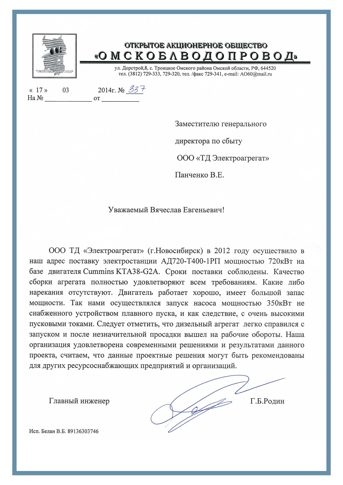 [ALT] => Отзыв контрагентов о компании ООО «ТД Электроагрегат» и исполненном проекте для ОАО "Омскоблводопровод" Омская обл.