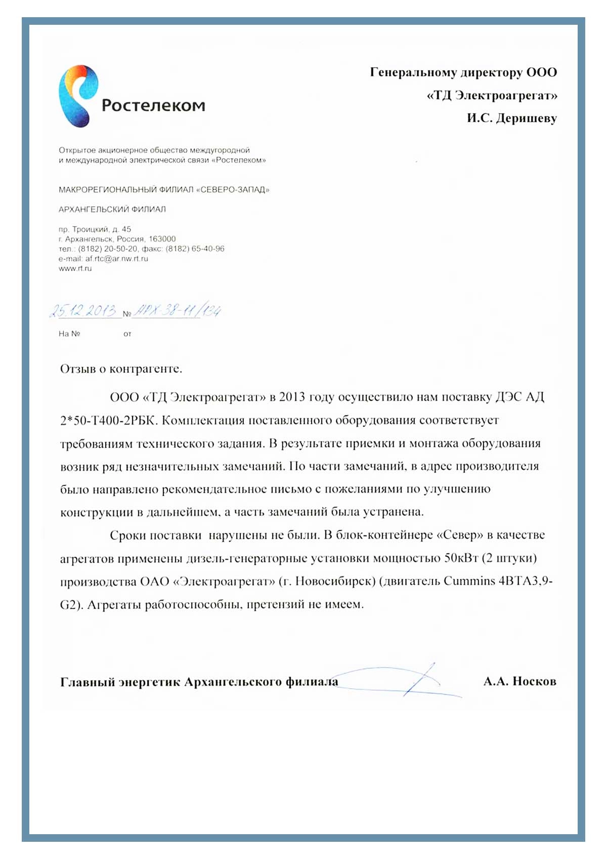 [KEYWORDS] => Отзыв ОАО "Ростелеком" г. Архангельск о работе с ООО "ТД Электроагрегат", отзыв о поставке и монтаже ДГУ, отзыв о поставке ДЭС АД 2*50-Т400-2РБК