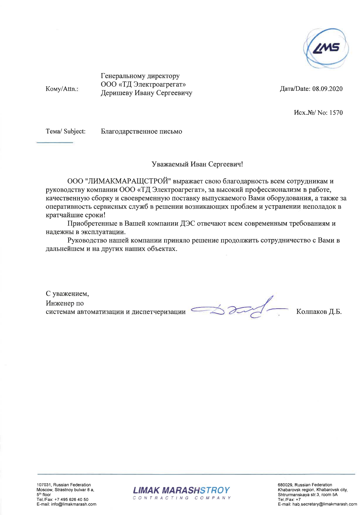 ООО "ЛИМАКМАРАЩСТРОЙ" выражает свою благодарность всем сотрудникам и руководству завода "ТД Электроагрегат" за высокий профессионализм в работе, качественную сборку и своевременную
