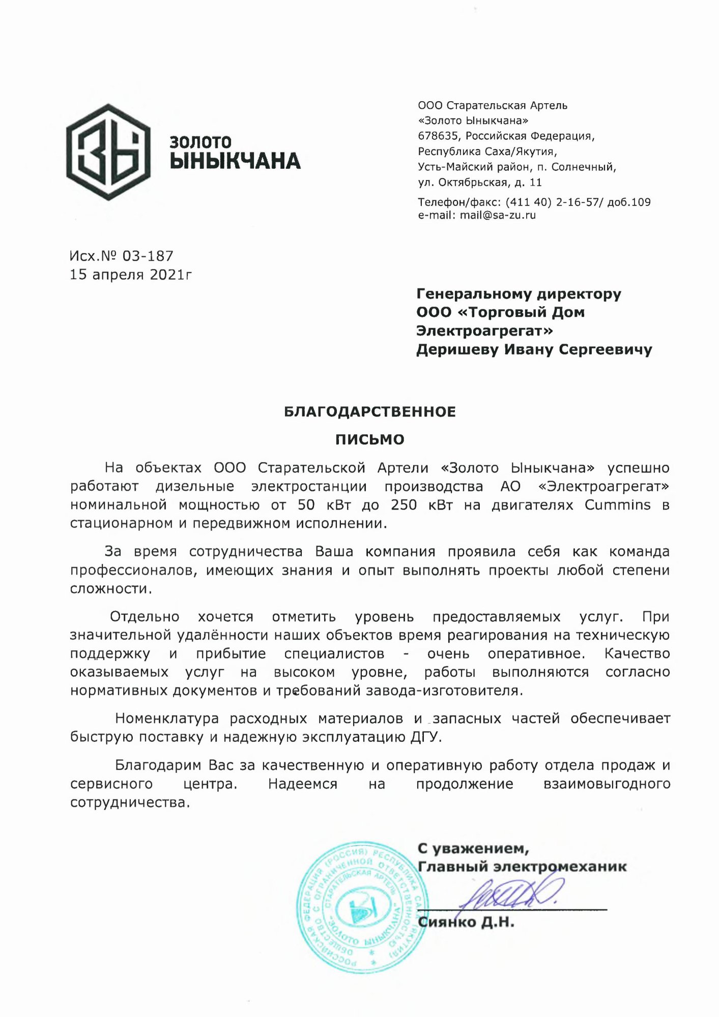 ) ) [reviewBody] => Генеральному директору завода "Торговый Дом Электроагрегат" Деришеву Ивану Сергеевичу БЛАГОДАРСТВЕННОЕ ПИСЬМО.      На объектах ООО Старательской Артели "Золото Ыныкчана" успешно работают дизельные электростанции производства завода "Электроагрегат" номинальной мощностью от 50 кВт до 250 кВт на двигателях Cummins в стационарном и передвижном исполнении.    За время сотрудничества Ваша компания проявила себя как команда профессионалов, имеющих знания и опыт выполнять проекты любой степени сложности.    Отдельно хочется отметить уровень предоставляемых услуг. При значительной удаленности наших объектов время реагирования на техническую поддержку и прибытие специалистов-очень оперативное. Качество оказываемых услуг на высоком уровне, работы выполняются согласно нормативных документов и требований завода-изготовителя.    Номенклатура расходных материалов и запасных частей обеспечивает быструю поставку и надежную эксплуатацию ДГУ.    Благодарим Вас за качественную и оперативную работу отдела продаж и сервисного центра. Надеемся на продолжение взаимовыгодного сотрудничества. С уважением, Главный электромеханик Сиянко Д.Н. ) )