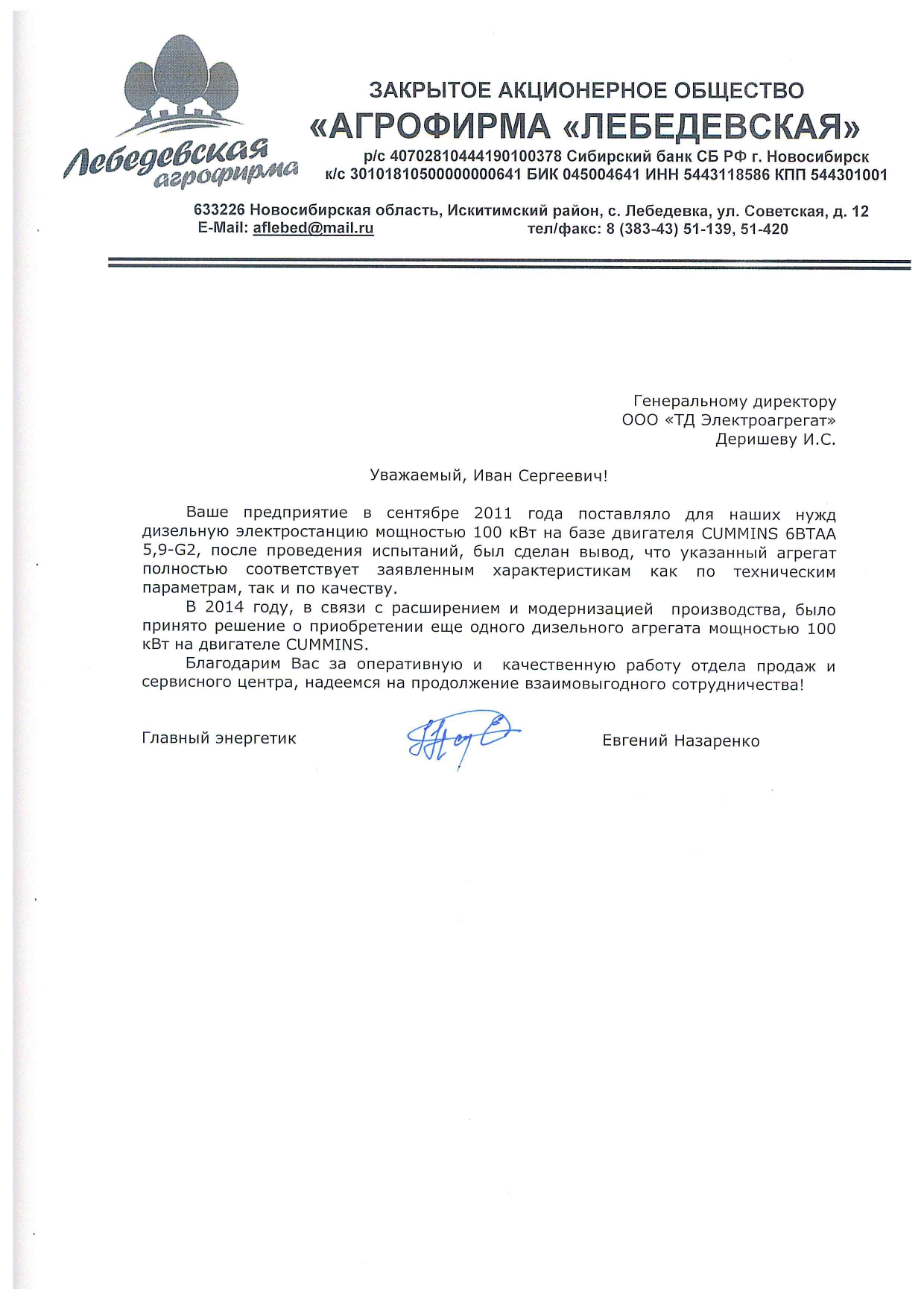 [ALT] => Отзыв контрагентов о компании ООО «ТД Электроагрегат» и исполненном проекте для ЗАО "Агрофирма "Лебедевская", Новосибирская обл.